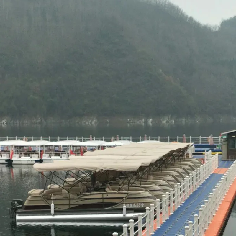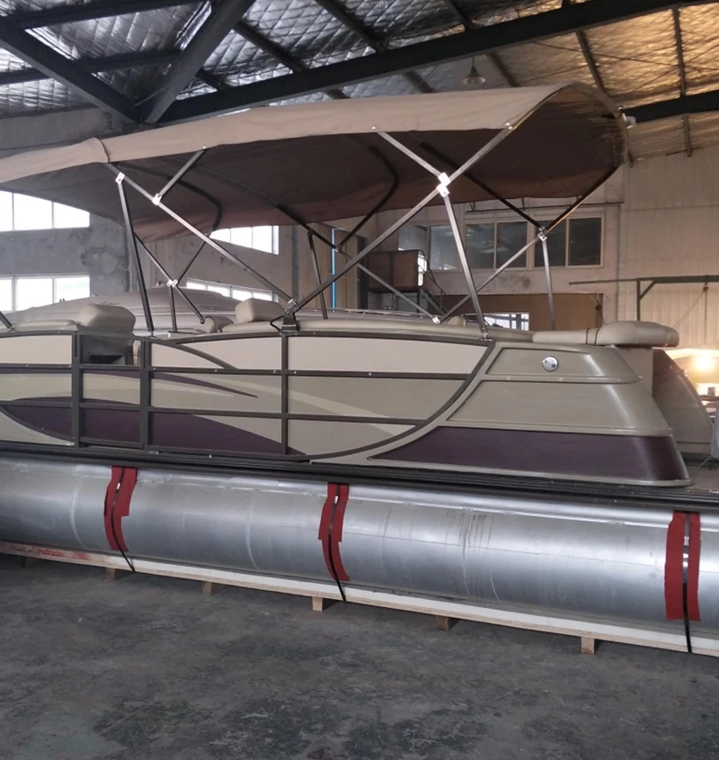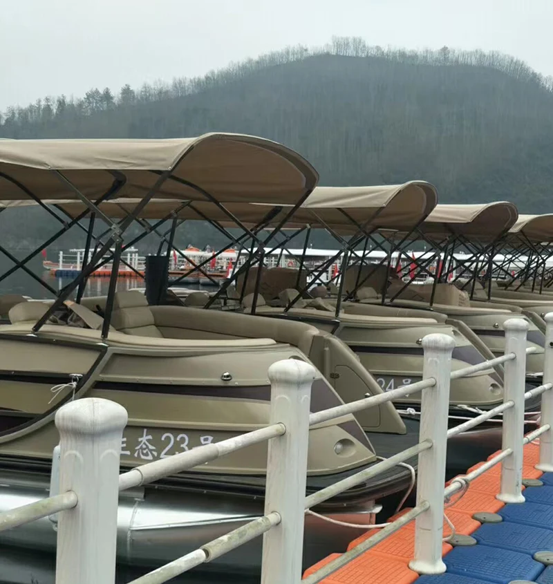 Доња труп запад®Чамац од фибергласа и алуминијума је направљен од алуминијума који је јак и лакши, ограда је израђена од фибергласа и омогућава глатку и естетскију угоднију облику чамца. Ладвада®Понтонски брод има пространи простор и опремљен је луксузним водоотпорним кожним каучем и сунца, дизајнирао је за разгледање, риболов, слободно вријеме на води.